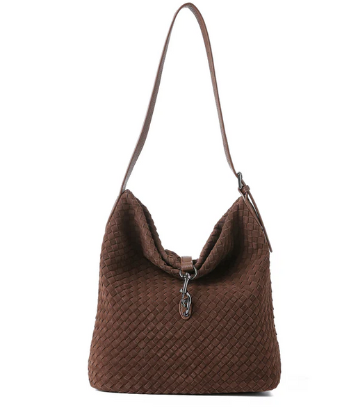 Woven vegan suede shoulder bag with a back slip pocket. Magnetic closure and exterior lobster closure.