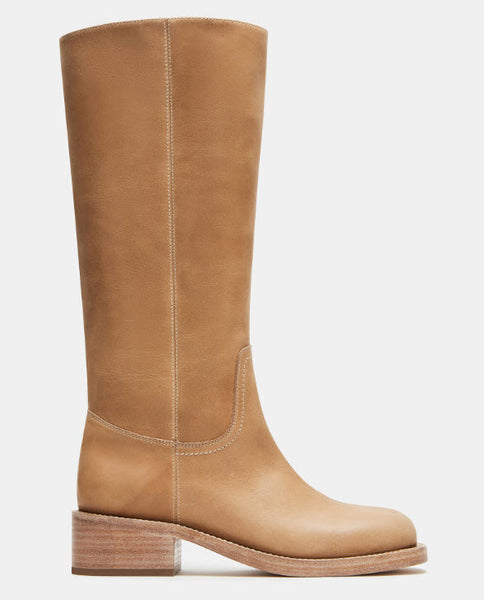 Square toe to-the-knee tall leather boot with stack heel. Synthetic sock, lining & sole.