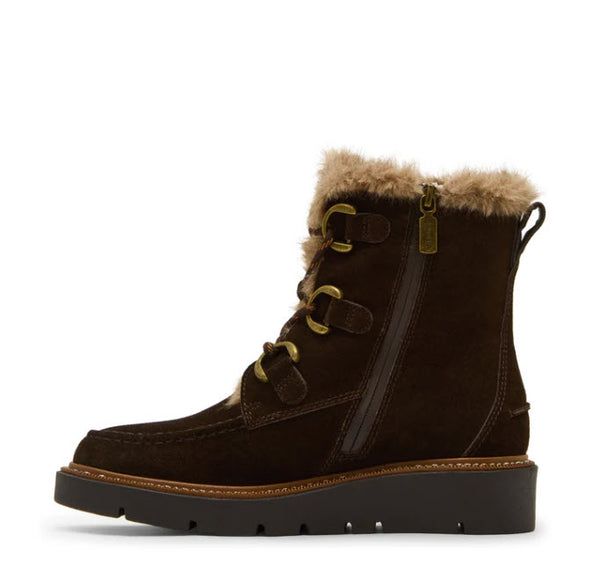 Waterproof suede upper with faux fur trim & sealed seams. Insolated lining & rubber sole. Zipper not waterproof.