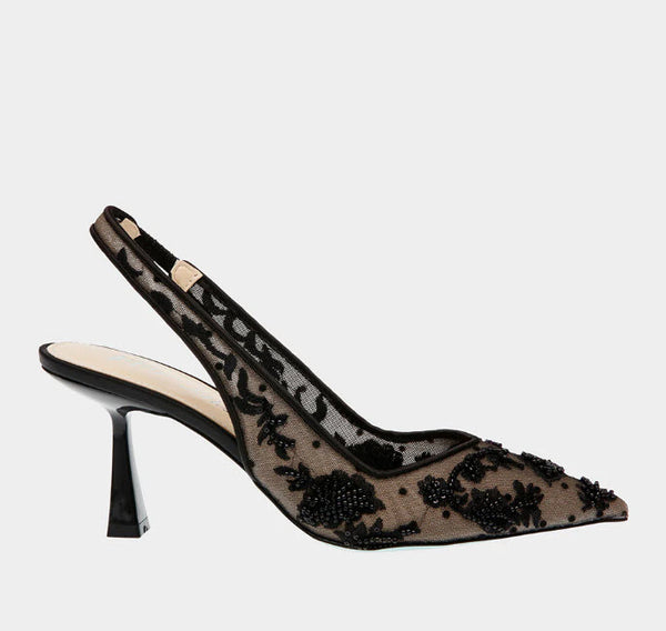 The sequin embellished sling mesh pump on mid sculpted heel. Textile upper, synthetic lining & outsole.