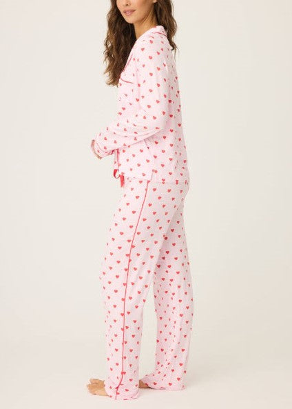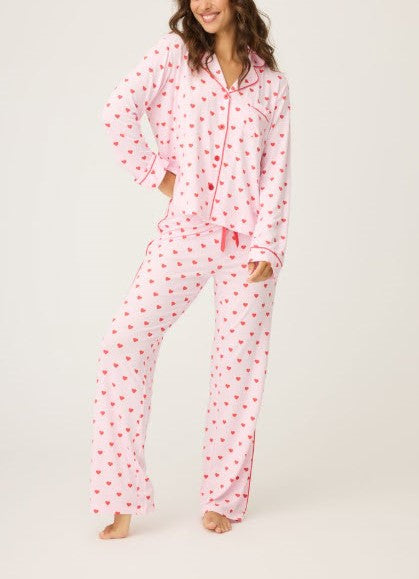 This three-piece pajama set features a button-down top and relaxed pants in pink modal jersey sprinkled with red hearts. The matching eye mask seals the deal—literally. Equal parts cozy and cute, it’s love at first lounge.
